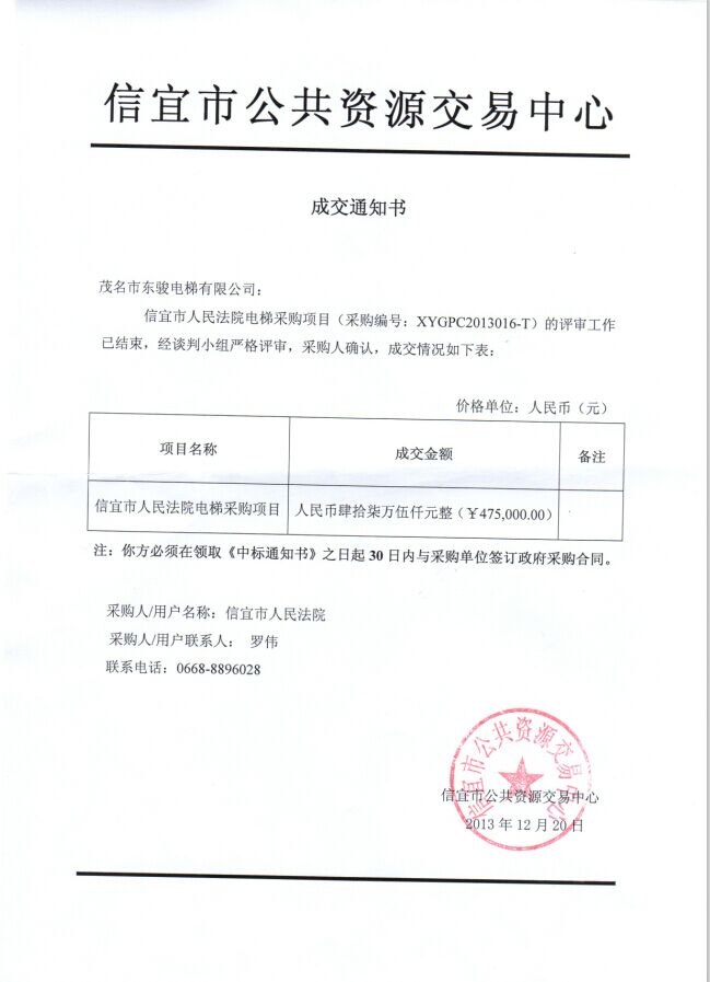 祝賀茂名市東駿電梯有限公司中標(biāo)信宜市人民法院電梯設(shè)備采購(gòu)招標(biāo)項(xiàng)目 |