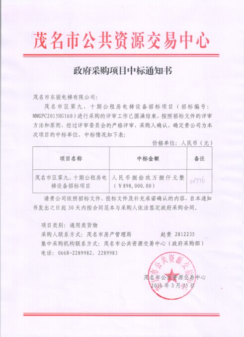 祝賀茂名市東駿電梯有限公司中標(biāo)茂名市區(qū)第九、十期公租房電梯設(shè)備招標(biāo)項(xiàng)目 |